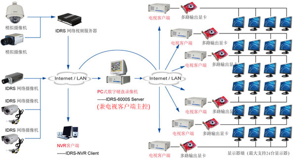 3)以IDRS-NVMS網絡視頻集中管理系統作為主控設備的網絡電視墻典型應用原理圖: