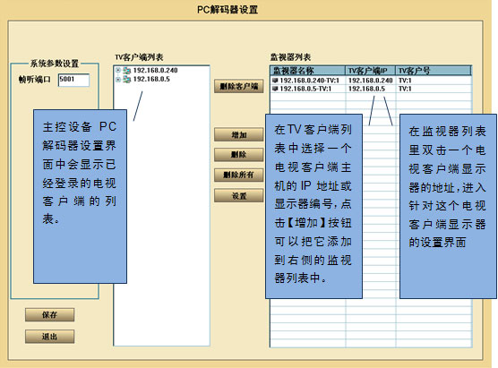 第二步:進入主控設備軟件中的PC解碼器設置界面,對電視客戶端進行配置。